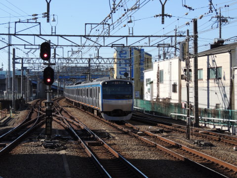 西横浜駅の南側を走行する横須賀線のE217系 (←写真左) 西横浜駅の南側(写真のホーム左側)には、JR東日本の東海道線の上下線と横須賀線の上下線が通っています。 左の写真は、西横浜駅の1番ホーム(二俣川・海老名・湘南台方面)の東端側(平沼橋・横浜寄り)にて撮影したもので、写真奥側が西方向で保土ヶ谷・戸塚方面(大船・小田原方面)になります。 左の写真には、横須賀線の上り線を横浜駅方面(東京・千葉方面)へ行く「E217系」が見えています。 2015.01.11現在 |