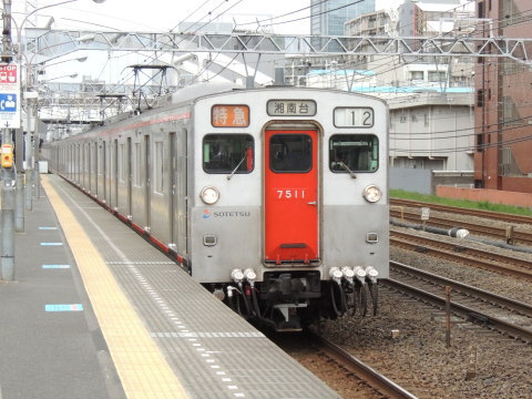 相鉄 7000系 始発駅の横浜駅方面から平沼橋駅の1番ホームに進入・通過していく、7000系(7712編成)「特急 湘南台」行です。 2014.05.08現在 |