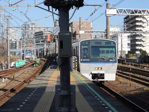 相鉄 8000系(下り) 西横浜駅方面(横浜方面)から、天王町駅(1番線)に接近中の、8000系(8701編成)「各停 湘南台」行(横浜始発)です。 天王町駅の2番ホーム東端側(西横浜・横浜寄り)にて撮影。 2015.01.11現在 |