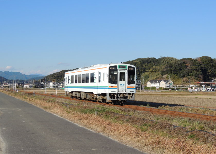 | 桜木駅を出発するTH2100形 桜木駅を出発して、いこいの広場駅方面(天竜二俣・新所原方面)へ行く、TH2100形(TH2113)「天竜二俣」行(列車番号233・掛川始発)です。 桜木駅の西方約200mあたりのところにある「富部前踏切」付近にて撮影したもので、写真右奥のほうには、桜木駅の駅舎と上りホームが見えています。 2015.12.31[15:00]現在 |