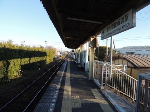 | ホーム東端側から東方向を見る ホームの東端側(掛川市役所前・掛川寄り)から、東方向の掛川市役所前駅方面(掛川方面)を撮影したもので、この先約500mあたりのところに掛川市役所前駅があります。 2015.12.31現在 |