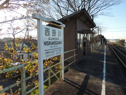 | 西掛川駅(にしかけがわ) 上の写真は、西掛川駅を南西側から撮影したもので、写真左側が西方向で桜木駅方面(天竜二俣・新所原方面)、右側が東方向で、掛川市役所前駅方面(掛川方面)になります。 西掛川駅は築堤上にホームがあり、ホーム上には待合室が設置されているのが見えています。 また、写真左下側には駅前(南西側)にある駐輪場が見えています。 [西掛川駅]…所在地地図 ・単式ホーム1面1線(築堤上にある地上駅) ・キロ程 1.8km(掛川起点) ・1954年(昭和29年)10月10日…旧国鉄二俣線の駅として開業 ・1987年(昭和62年)3月15日 …二俣線が第三セクター鉄道に転換し、天竜浜名湖鉄道の駅となる (※以上詳細「Wikipedia」参照) 2015.12.31現在 |