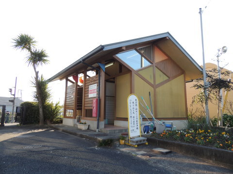 | 駅前に設置されているトイレと駐輪場 駅前には、トイレ(写真右側の建物)が設置されていて、その脇(写真のトイレの左側)には駐輪場があります。 2015.12.31現在 |