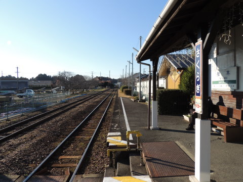 ホーム上に出た場所あたりから南方向を見る 駅入口から入ってホーム上に出た場所あたりから、南方向(桜木・掛川方面)を撮影したものです。 ホーム上には、待合室が設置されています。 2015.12.31現在 |