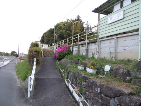 | 円田駅の手前の風景 円田公民館から坂道を上がってくると、写真のようにつきあたりに出ます。 そして、つきあたりから右側に続くスロープを上がって行くと、円田駅のホームに出ることができます。 2015.05.02現在 |