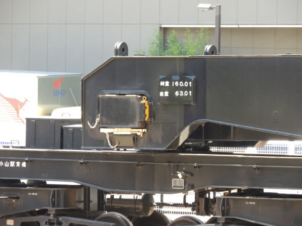 荷重・自重の表示 (←写真左) 「荷重 160.0t」、「自重 63.0t」と表示されています。 写真左下のほうには、「小山駅常備」と書かれています。 2018.06.30(Sat)現在 |