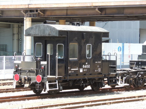 | ヨ8402 シキ801B2に連結されていた「ヨ8402」(ヨ8000形)です。 「ヨ8000形」は、1974年(昭和49年)から1979年(昭和54年)までに1,170両が製造された国鉄最後の車掌車なのだそうです。 従来の車掌車とは異なり、便所の設置、暖房の石油ストーブ化、制動時の静粛性の向上など乗務環境を向上させた最新設備の形式として大量に製造されて全国で使用されたようですが、1986年(昭和61年)に貨物列車の車掌乗務が原則廃止され、本来の用途を喪失し、翌年の1987年(昭和62年)4月に行われた国鉄からJRへの移行(国鉄分割民営化)では、添乗や控車などの用途に使用するため一部がJRに承継(計336両)されたそうです。 現時点では、鉄道車両の甲種輸送や大物車による特大貨物列車への係員添乗用や工事用などの特殊用途で、わずかながらも使用されていますが、現在の在籍数は国内で20両程度となっているようです。 (※以上詳細「Wikipedia」参照) 2018.06.30(Sat)現在 |