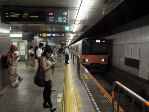 東急 8500系(下り) 東京メトロ半蔵門線の表参道駅方面(大手町・北千住方面)から渋谷駅(1番線)に進入中の、8500系(8636編成)「各駅停車 中央林間」行(南栗橋始発)です。 渋谷駅の1番ホーム東端寄り(表参道・大手町寄り)にて撮影。 東急田園都市線は、東京メトロ半蔵門線と相互直通運転を行っていて、渋谷駅のホームは地下3階にあります。 2016.08.13現在 |