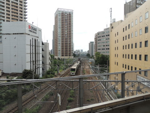 | ホームから見える山手線など① 東急池上線の五反田駅のホーム南端側(大崎広小路・蒲田寄り)から東側を見ると、JR山手線と、湘南新宿ラインや埼京線などが走行する山手貨物線が、ビルの合間から見えます。 写真には、JR山手線内回り(品川・東京方面行)「E231系500番台」が見えています。 なお、写真右奥方向がJR大崎駅方面(品川・東京方面)になります。 2016.07.23現在 |