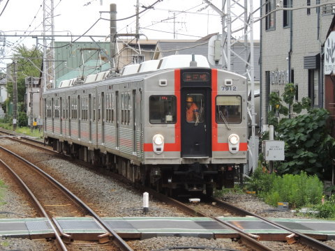 東急 7000系(下り) 始発駅の五反田駅方面から大崎広小路駅(1番線)に接近中の、7000系(7104編成)「各駅停車 蒲田」行です。 大崎広小路駅の1・2番線島式ホーム北東端側(五反田寄り)にて撮影。 2016.07.23現在 |