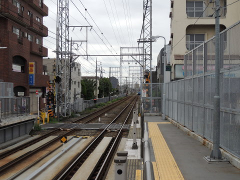 | 大崎広小路駅のホームの様子① 大崎広小路駅の駅番号は「IK02」で、島式ホーム1面2線の高架駅となっています。 写真左側(南東側)が1番ホーム「下り 旗の台・雪が谷大塚・蒲田方面」行で、右側(北西側)が2番ホーム「上り 五反田方面」行となっています。 大崎広小路駅の1・2番線島式ホーム北東端側(五反田寄り)から撮影。 2016.07.23現在 |