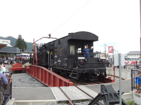 転車台にて方向転換を開始する「C11 207」+ヨ8709 安全確認が行われた後、転車台が回転し始めました。 2019.09.21(Sat)現在 |