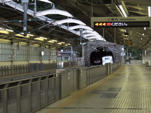 | 熱海駅のホームの様子(三島・静岡方) 熱海駅の東海道新幹線6番ホームの中ほどから、三島方(静岡・名古屋方面)のホームの様子を撮影したものです。 東海道新幹線の熱海駅は、駅が山肌にあるという地形による制約のために、線路及びホームが曲線形状で、待避線が無い相対式2面2線となっているという特徴があります。 待避線が無いので、ホームの目の前を高速の新幹線の通過列車が走行することになるため、安全のために、熱海駅の新幹線ホームドアは1974年(昭和49年)に日本国内で最初に設置されたホームドア(可動式ホーム柵。当初のものは老朽化のために取り換え済み)となっています。 ホームドアが設置されるまでは、熱海駅停車列車の到着直前まで改札制限を行うことで、安全性を確保していたようです。 また、熱海駅には待避線が無いため、こだま号に乗っていて熱海駅が近くなると、車掌さんの車内アナウンスで「あと5分ほどで熱海駅に到着します。熱海駅ではお客様の乗降後すぐの出発となりますので、熱海駅でお降りのお客様は準備をお願いします。」(良く経験する上り列車の場合)という案内放送が行われます。 2019.10.13(Sun)現在 |