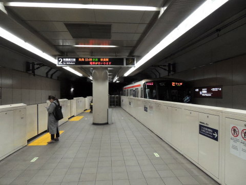 | ホーム(地下4階)の様子 つくばエクスプレスのホームは、改札口と切符売場のある地下1階からさらに地下方面へ下りた地下4階にあります。 ホームは島式ホーム1面2線となっていて、秋葉原駅は起点駅であるため、1・2番線ともに折り返し「つくば方面」への列車の乗り場となっています。 1・2番ホームともに、安全のためのホームドアが設置されています。 2018.01.27現在 |