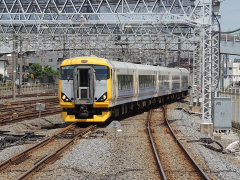E257系500番台 特急「新宿さざなみ3号」(下り) 本千葉駅方面(千葉・津田沼方面)から蘇我駅(5番線)に接近中の、E257系500番台(NB-05編成)特急「新宿さざなみ3号」(8047M・新宿→館山)です。 蘇我駅の6番線ホーム北端側(本千葉・千葉寄り)にて撮影。 ☆特急「新宿さざなみ3号」の停車駅及び主要駅の発着時刻 新宿(09:08始発)→秋葉原(09:19-19)→錦糸町(09:25-26)→船橋→津田沼→千葉(09:52-53)→蘇我(09:58-59)→五井→木更津(10:21-22)→君津(10:28-29)→佐貫町→浜金谷→保田→岩井→富浦→館山(11:16着) 2015.06.28(Sun)[09:58]現在 |