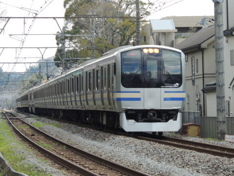 | 横須賀線 E217系 東戸塚駅(上り) 戸塚駅方面(大船・鎌倉方面)から東戸塚駅(1番線)に接近中の、E217系「普通 千葉」行(1034S・久里浜始発)です。 東戸塚駅の1番線ホーム南端側(戸塚・大船寄り)にて撮影したもので、写真右側に見える2本の線路は東海道貨物線の上下線です。 2014.06.09現在 |