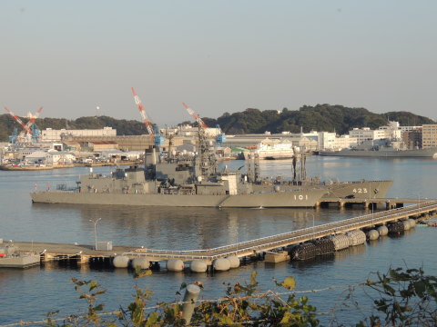 | 横須賀線 田浦~横須賀間にて車窓から見える海上自衛隊の艦艇 横須賀線の田浦~横須賀間の北東側の車窓には、横須賀基地に停泊する海上自衛隊の艦艇を見ることができます。 横須賀線の下り列車(横須賀・久里浜方面)の車内から撮影したもので、写真左側が田浦駅方面(逗子・大船方面)、右側が横須賀駅方面(久里浜方面)になります。 2014.09.28現在 |