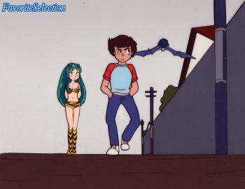 ラムと諸星あたる ~Lum Invader(Lamu), Ataru Moroboshi(Ronnie) 上のセル画のラムについては第1回第2話「町に石油の雨がふる」にて使用されたものです。 しかし上のセル画左下のあたるについてはラムと一緒に入手したものですが、下の参考引用TV画像をご覧頂いておわかりのように組み合わせがあっておらず、別の話で使用されたもののようです。 背景は合致していません。 なお、TVアニメの第1回第1話及び第2話については、『機動警察パトレイバー』、『攻殻機動隊』、『スカイ・クロラ The Sky Crawlers』などの作品の監督で有名な押井守さんがコンテと演出の担当だったようです。 |