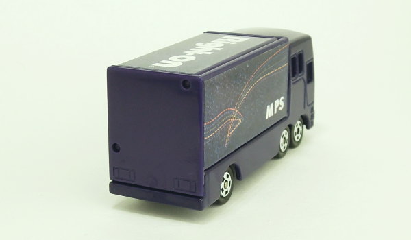 | Right-on(ライトオン)オリジナル イベントカー 2015年5月15日(金)に、ジーンズセレクトショップ・衣料品販売会社「Right-on」(ライトオン)にて発売された「キッズトミカTシャツ」の購入特典となっていた「Right-on(ライトオン)オリジナル イベントカー」のトミカ(ベトナム製/No.37-5)です。 車体色は紺色系で、車体後部荷台には、衣服のジーンズをイメージさせる色と絵柄が施された下地に「Right-on」、「BACK NUMBER KIDS」、「MPS」と書かれたシールが貼られています。 トミカとしては、2009年10月に発売された「コカ・コーラ イベントカー」(No.37-5)がベースとなっています。