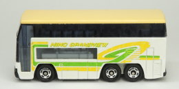 | 日野 グランビューバス(日本製) 1986年7月に発売された「日野 グランビューバス」(No.1)の、発売当初のモデルのデザインとなっている、日本製のバリエーションのトミカ(No.1-3)です。 車体側面には「HINO GRANDVIEW」と書かれ、文字や車体側面のデザインのカラーには黄緑色系が用いられているのが特徴です。 なお、この「日野 グランビューバス」(No.1-3)のトミカは、1986年7月から2000年6月まで、日本製と中国製のものが約14年間にわたって販売されたロングセラーモデルとなっていて、現時点では、箱無しのものであれば、中古ホビーショップなどでもよく見かける比較的入手しやすいトミカとなっています。