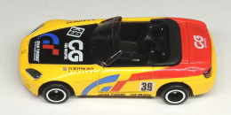 | ホンダ S2000 筑波9時間耐久レース仕様 2000年2月に発売された「グランツーリスモ2」(GRAN TURISMO 2/6台セット)に入っていた「ホンダ S2000 筑波9時間耐久レース仕様」のトミカ(中国製/No.64-3)です。 「グランツーリスモ2」(GRAN TURISMO 2/6台セット)は、プレイステーション用ゲームソフト「グランツーリスモ2」に登場する車種をモデルにしたセットとなっています。 車体色は黄色・黒色・赤色基調で、車体には「39」、「CG CAR GRAPHIC」、「GT GRAN TURISMO」、「POLYPHONY DIGITAL」、「ADVAN」などと書かれていて、このトミカは、1999年8月に行われた「筑波9時間耐久レース」に参戦し、クラス1位、総合2位を獲得した、実車のグランツーリスモカラーのS2000がモデルとなっているようです。