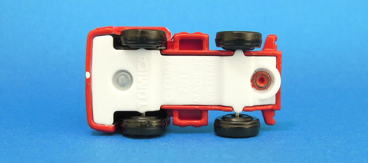 前述のとおり、実車のトラクターは、スウェーデンの「スカニア」(SCANIA)製となっているものと思われますが、トミカでは、実車のトラクターの車体デザインが忠実に再現されているわけではなさそうで、トミカのトラクター底面には、特にトラクターのメーカー名の刻印はありません。
