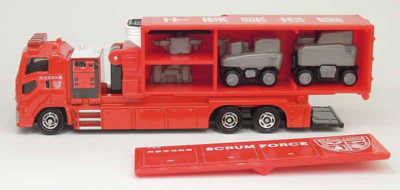 この「市原市消防局 スクラムフォース」のトミカ本体の後部コンテナ部分は可動仕様(コンテナ積み下ろし)となっていて、コンテナ内部にはロボット4台が積載できるようになっています。