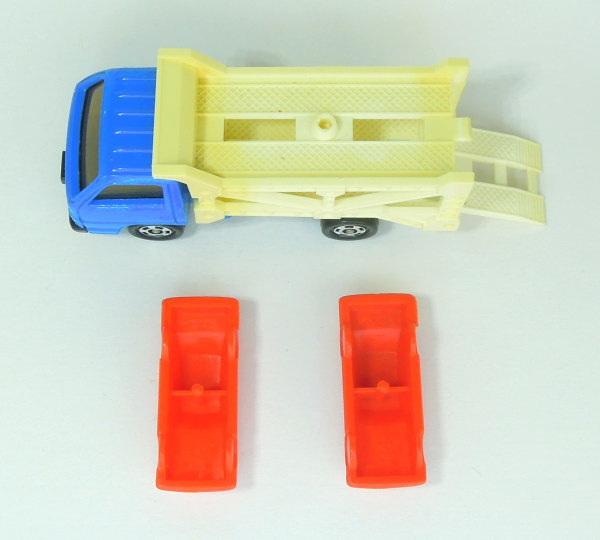 このトミカの最大の特徴は、荷台後部のキャリア出口(ロードプレート)が開閉可動仕様となっていて、後部荷台に積まれた2台(2個)の赤色のプラスチック製の乗用車を積んだり降ろしたりして遊ぶことができることです。