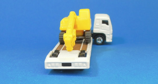 「いすゞ ギガ」がベースの低床トレーラーがモデルのトミカとなっていて、トレーラー部分に載せることができるプラスチック製の重機のミニチュアが付属しています。