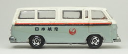 | 日本航空 キャブオール連絡車 1975年(昭和50年)4月に発売された「日本航空 キャブオール連絡車」(No.101)のトミカ(日本製/No.101-1)です。 このトミカの「キャブオール」は、日産自動車がかつて製造していた、ヘッドランプが4灯の2代目「キャブオール」(1966年~1976年)にあたるようです。 屋根上には「101」と書かれたシールが貼られ、車体側面には、日本航空(JAL)の赤い「鶴丸マーク」が描かれ「日本航空」と書かれたシール(上部に赤色と紺色系の帯)が貼られています。