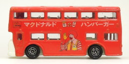 | マクドナルド パーティーバス (ロンドンバス) 1998年8月に発売された「マクドナルド・カーセット」(4台セット)に入っている「マクドナルド パーティーバス」(ロンドンバス)のトミカ(中国製/No.95-3-4)です。 このトミカは、2000年10月に発売された「トミカタウン マクドナルド ドライブスルー」(トミカ3台付き)に入っている「マクドナルド パーティーバス」(ロンドンバス)のトミカ(中国製/No.95-3-10)と車名(商品名)が同じで、一見すると外観も似ていますが、車体に貼られたシールの文字と描かれた「ドナルド」の姿が異なり、車体後部の下部の色も異なって(赤と白の違い)います。