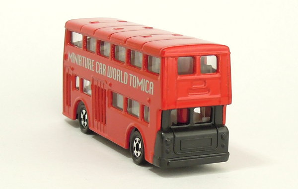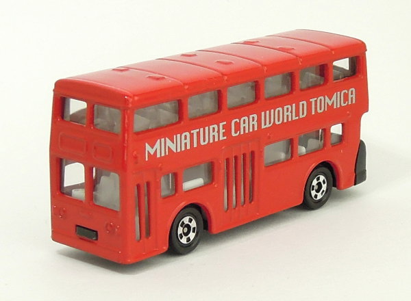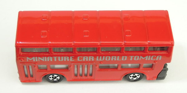 | ロンドンバス (トミカくじⅢ) 2001年12月に発売された「トミカくじⅢ」(全20種)のうちの1台となっていた「ロンドンバス」のトミカ(中国製/No.95-3)です。 このトミカは、車体の左右両側面に銀色(シルバー)の文字で「MINIATURE CAR WORLD TOMICA」と書かれているのが特徴です。