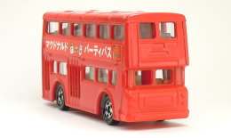 | マクドナルド パーティーバス (ロンドンバス) 2000年10月に発売された「トミカタウン マクドナルド ドライブスルー」(トミカ3台付き)に入っている「マクドナルド パーティーバス」(ロンドンバス)のトミカ(中国製/No.95-3-10)です。 このトミカは、1998年8月に発売された「マクドナルド・カーセット」(4台セット)に入っている「マクドナルド パーティーバス」(ロンドンバス)のトミカ(中国製/No.95-3-4)と車名(商品名)が同じで、一見すると外観も似ていますが、車体に貼られたシールの文字と描かれた「ドナルド」の姿が異なり、車体後部の下部の色も異なって(赤と白の違い)います。