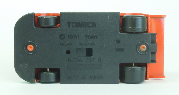 車体底面には、「MAZDA 787 B」、「TOMICA ©1991 TOMY」、「NO.34 S=1/64」、「MADE IN JAPAN」などの刻印があります。