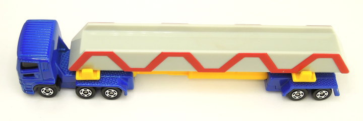 このトミカは、積載物パーツとして鉄骨、パイプ、ロボットアームの3種類が用意されて遊びの範囲が広くなっていて、上の写真はパッケージに描かれた、鉄骨を積載した状態のポールトレーラーのトミカを撮影したものです。