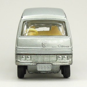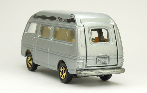 | ニッサン キャラバン ハイルーフ バン 1980年(昭和55年)7月に発売された「ニッサン キャラバン ハイルーフ バン」(No.3)のバリエーションの1つとなっているトミカ(日本製/No.3-3)です。 このトミカの「ニッサン キャラバン ハイルーフ バン」は、初代「日産 キャラバン」(駆動方式はFR/1973年[昭和48年]2月~1980年)にあたり、1978年(昭和53年)5月のマイナーチェンジにより、「トヨタ ハイエース」に対抗するために追加された屋根部分が高くなっている「ハイルーフ バン」がモデルとなっています。