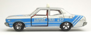 | ニッサン セドリック 空港タクシー 1979年2月に発売された「ニッサン セドリック 空港タクシー」(No.47)のトミカ(日本製/No.47-3)です。 1975年6月から1979年6月まで販売された4代目「セドリック」(330型系)の、2800cc車のグレード「SGL」がベースとなっている空港タクシー仕様のトミカとなっています。 車体色はシルバー(銀色)基調で、車体各部に青色系の模様やラインがデザインされて「AIRPORT TAXI」と書かれているのが特徴です。
