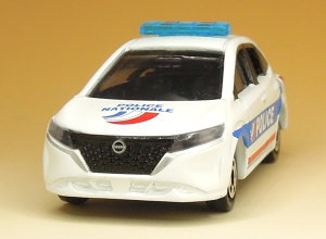 | 日産 ノート フランス警察仕様 2022年7月23日(土)に「イオン」限定にて発売された「AEON NO.63」の「日産 ノート フランス警察仕様」のトミカ(ベトナム製/No.103-8)です。 このトミカは、2020年12月23日から販売が開始された、実車の3代目「ノート」(E13型)がベースのフランス警察仕様(国家警察仕様)となっています。 フランス国家警察(Police nationale de France)の実車のパトカーのデザインと同様に、車体のボンネット部分には「POLICE NATIONALE」と書かれて国家警察のロゴマークも描かれ、また、車体側面には「POLICE」と書かれています。