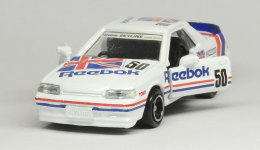 | リーボック スカイライン(R31) 2007年8月20日(月)に発売された「長谷見昌弘 レーシングスカイライン コレクション」(全6種/記念ステッカー付)のうちの1台となっていた「リーボック スカイライン(R31)」のトミカ(中国製/No.84-3)です。 このトミカの「リーボック スカイライン」は、7代目「スカイライン R31型」(1985年8月~1990年)の「GTS-R」がベースとなっていて、1988年と1989年に開催された全日本ツーリングカー選手権(JTC-1/グループA)に参戦した「ハセミモータースポーツ」の実車がモデルで、1989年には「ハセミモータースポーツ」の長谷見昌弘選手とアンデルス・オロフソン選手がドライブして3勝を挙げ、シリーズチャンピオンを獲得しています。