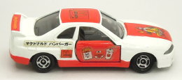 | マクドナルド GTカー 1998年8月に発売された「マクドナルド・カーセット」(4台セット)に入っている「マクドナルド GTカー」のトミカ(中国製/No.20-7-81)です。 1995年7月に発売された「日産 スカイライン GT-R(R-33)」(No.20-7)のトミカがベースとなっていて、車体色は白色と赤色基調で、車体各部に「マクドナルド」のロゴマークやキャラクターなどが描かれたシールが貼られています。