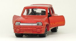 | ルノー5 ターボ 1981年12月に発売された「ルノー5 ターボ」(No.F25/外国車シリーズ・フランス車)のトミカ(日本製/No.F25-2)です。 「ルノー5 ターボ」は、ルノーが1972年に発売しヨーロッパ中においてベストセラーになった大衆車の「ルノー5」(5はフランス語でcinq[サンク]と読む)のターボ車で、WRC(世界ラリー選手権)のグループ4のホモロゲーションモデル(レースに参戦するために開発・販売された規定に合った市販車)として、1978年10月のパリモーターショーで発表され、1980年に発売が開始されています。