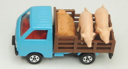 | スズキ キャリィ 家畜運搬車 1980年7月に発売された「スズキ キャリィ 家畜運搬車」のトミカ(日本製/No.39-3)です。 このトミカは、豚のミニチュアが2頭付属しているのが最大の特徴で、発売当初は車体色が黄色基調だったようで、写真のトミカは車体色が水色基調となっていて、日本製でも後期のバリエーションのものになります。 また、このトミカは2001年1月まで約19年6ヵ月にわたり販売されたロングセラーモデルとなっていて、中国製のものも存在します。