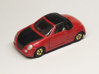 | ダイハツ コペン (初代) 2002年(平成14年)5月に発売された「ダイハツ コペン」(No.15)のトミカ(中国製/No.15-6)です。 このトミカの「コペン」は、ダイハツが2002年6月から2012年9月の間に製造・販売した軽自動車規格の前輪駆動2人乗りオープンカーの初代「コペン」(L880K型)です。 車名は、「Community of Opencar life」から「COPEN(コペン)」とされたそうです。 64馬力(ps)を発生する659cc 直列4気筒DOHCツインスクロールターボJB-DETエンジンを搭載し、トランスミッションは4速ATまたは5速MTとなっています。