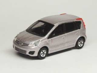 日産 ノート(初代・E11型) 2009年(平成21年)6月から7月頃に、ディーラーのカラーサンプルや販促用などの目的で販売されたとされる「日産 ノート」(初代・E11型)のトミカです。 通常品と比較すると、細部のカラーリングが異なり、ヘッドライトがクリアパーツ使用などの違いがあり、また、車体底面にはカラーリングの名称が書かれている、などの違いがあります。