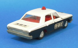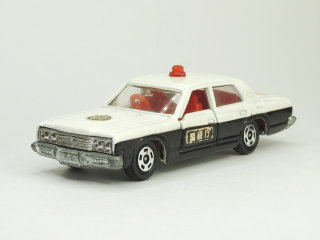 | クラウン パトロールカー (日本製/3代目クラウン) 1970年8月に発売された「クラウン パトロールカー」(No.4)のトミカ(日本製/No.4-1)です。 1967年9月から1971年2月まで販売された3代目「トヨタ クラウン」(当時はトヨペット クラウン)がベースのパトカーのトミカとなっていて、このトミカはパトカーのトミカとして初めて発売された、記念すべき「パトカーのトミカ第1号」となっています。 なお、写真のトミカは「1Eホイール」のバリエーションとなっていて、厳密には発売最初期の「1Aホイール」のNo.4-1-1のトミカが「パトカーのトミカ第1号」となります。 また、「クラウン パトロールカー」(No.4-1-1)のトミカは、トミカが初めて1970年8月に発売された時の6台(6車種)のうちの1台となっています。