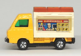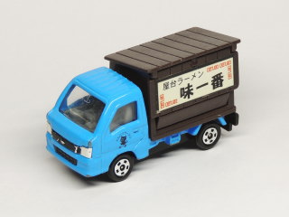 スバル サンバー ラーメン屋 (屋台ラーメン 味一番) 2008年9月に発売された「スバル サンバー ラーメン屋」(No.35)のトミカ(中国製/No.35-5)です。 運転席ドアの部分には「とんこつラーメン 味一番」と書いてあって「豚」さんのマークも描いてあります。 後部積載部の側面には「屋台ラーメン 味一番」と書いてあります。 また、後部の屋台部分は側面を開くことができ、屋台を展開できる仕組みとなっています。