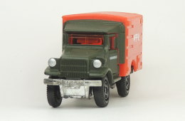 | トヨタ タイプHQ15V 集配車 (日本郵便逓送) 2005年4月に発売された「オリジナルトミカ 郵便車コレクション2(名古屋市内限定版)」(4台セット/丸型ポスト付き)に入っている「トヨタ タイプHQ15V 集配車(日本郵便逓送)」のトミカ(中国製/No.67-2)です。 1978年4月に発売された「トヨタ 自衛隊救急車(HQ15V型)」(No.67-2)のトミカがベースとなっていて、運転席ドア部分には「日本郵便逓送」と書かれています。 また、後部荷台部分は赤色で、荷台側面には「郵〒便」と書かれています。