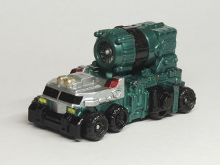 サイドビュー ボディ上部にあるキャノン砲は可動仕様で、小型ビークルが格納されて発車される、フロントカバー部分にあるアームも可動仕様となっています。