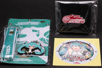 左側が「オリジナルステッカー」で、右側が「レーシングミク ラバーストラップ」です。 ステッカーは勝利を喜ぶかのような笑顔がとても素敵で、ラバーストラップはとても可愛らしい出来となっています♪ (2011.11.11) |